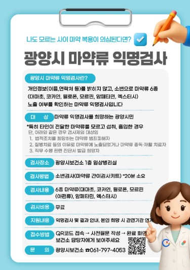 검사 대상은 마약류 노출이 의심되거나 검사를 희망하는 광양시민이다. 검사 비용은 무료이며, 이름을 밝히지 않고 익명으로 받을 수 있다.