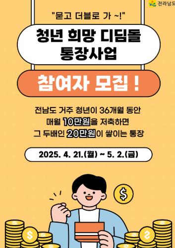 청년 희망디딤돌 통장은 청년이 지역에서 안정적으로 미래를 설계하도록 전남도와 청년이 함께 통장을 개설하고, 공동으로 자금을 적립하는 방식으로 자산 형성을 지원하는 사업이다.