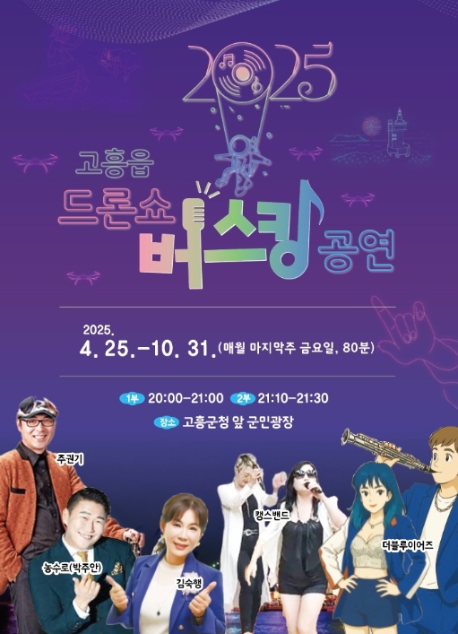이번 공연은 아나운서 박광신의 진행 아래, '더 블루 이어즈'의 락, K-pop 공연과 미스터트롯 3 출연 가수 '농수로'의 공연이 어우러져, 가요부터 트로트까지 다양하고 즐거운 공연을 선보일 예정이다. 드론쇼 종료 후에는 고흥 출신 트로트 가수 '김숙행'이 열기를 이어받아 공연을 펼칠 예정이다.