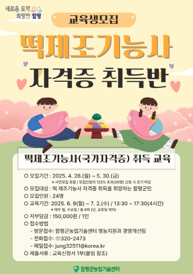 함평군은 28일 “떡제조기능사 자격증 취득반 교육생 사전 모집이 이날부터 내달 9일까지 실시되며, 본 모집은 5월 19일부터 30일까지 진행된다”고 밝혔다.