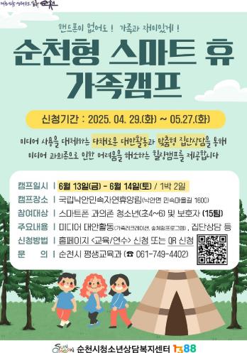 신청기간은 오는 27일까지 선착순으로 모집하며, 순천시청소년상담복지센터 누리집 또는 홍보 포스터의 QR코드를 활용하면 된다.