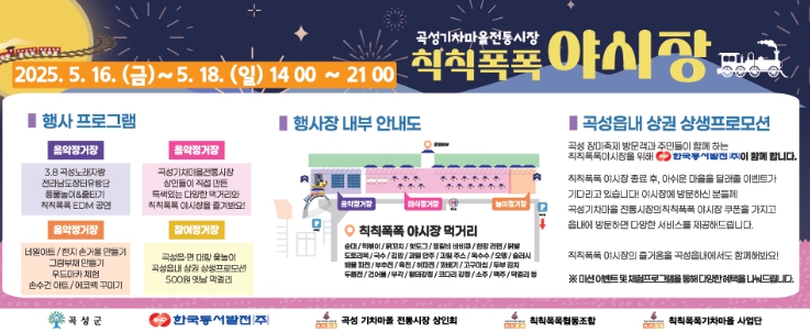 조상래 곡성군수는 “칙칙폭폭야시장은 단순한 야시장이 아닌, 곡성 전통시장과 지역상권이 함께 만드는 브랜드 축제”라며, “가족 단위 방문객부터 지역민까지 모두가 함께 즐기며 참여하는 의미 있는 행사가 될 것”이라고 전했다.