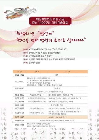 [코리아피플뉴스]대한불교조계종 19교구 지리산대화엄사 교구장 우석스님은 주지스님 취임 첫 대외 행사로 불기 2569년 2025년 5월 30일 오후 1시부터 서울 종로구 한국불교역사문화기념관 전통문화공연장(서울 종로구 우정국로 55)에서 제19교구본사 지리산 대화엄사와 불교문화콘텐츠개발원 공동 주관으로 “해동화엄초조 의상스님(625-702) 탄신 1400주년 기념 학술대회”를 개최한다고 밝혔다.