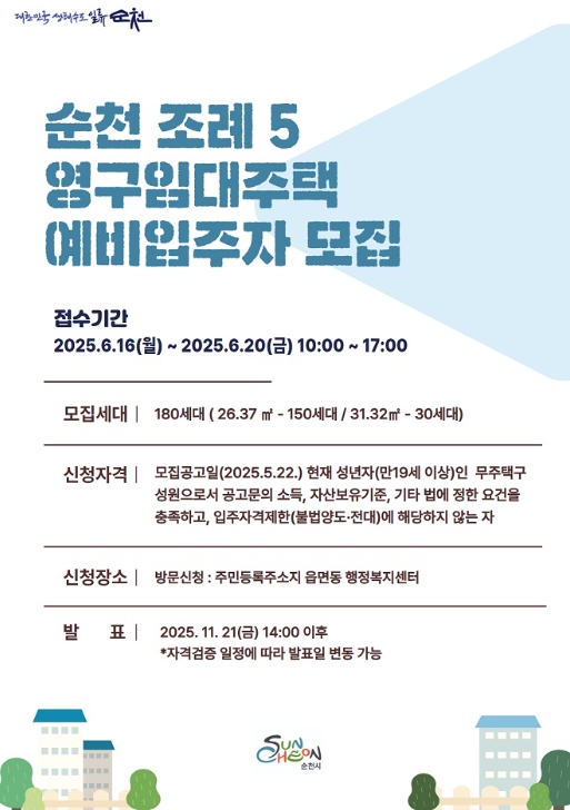 시 관계자는 “영구임대주택은 가장 취약한 계층의 주거 안정을 위한 최일선 안전망”이라며, “필요한 분들이 신청 기회를 놓치지 않도록 주민들의 많은 관심과 참여를 부탁드린다”고 전했다.
