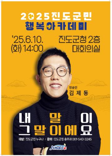 ‘진도 군민행복 아카데미’는 ‘민선 8기 군민행복 프로젝트’ 중 하나로 지난해에 김정운 박사, 극단 깍지, 유인경 기자, 박지헌 가수, 한문철 변호사 등 다양한 분야의 저명인사를 초청해 군민의 지성과 감성을 채우고, 수준 높은 문화서비스를 제공하며 군민들의 큰 호응을 얻었다.