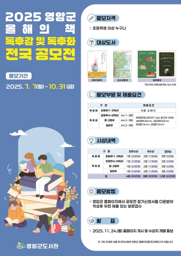 노재영 영암군 인재육성체육과장은 “올해의 책으로 영암을 전국에 알리고, 책을 사랑하는 국민이 영암을 찾는 계기를 만들겠다. 전국 많은 독서인들의 공모전 참여를 바란다”고 당부했다.