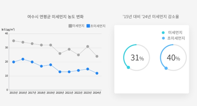 2024년 여수시의 연평균 미세먼지(PM-10) 농도는 24㎍/㎥, 초미세먼지(PM-2.5)는 12㎍/㎥로 최근 10년간 측정 이래 가장 낮은 수치를 기록했다.