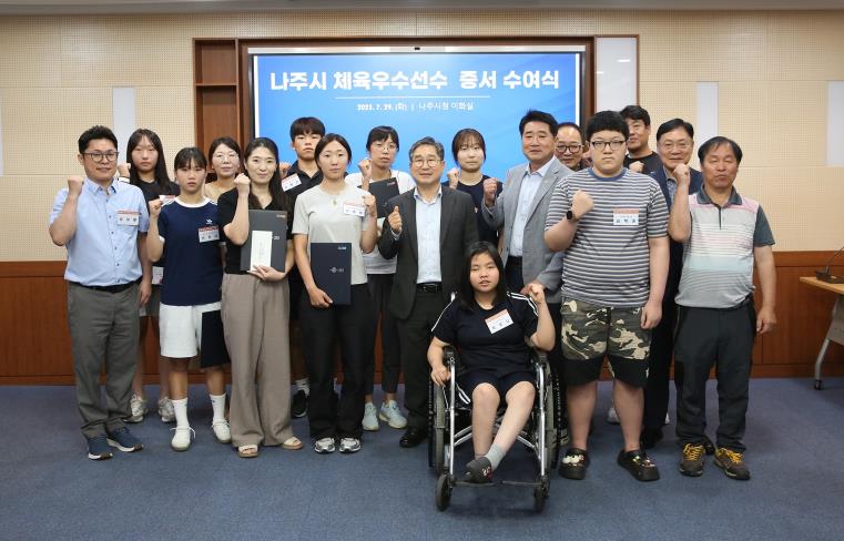 나주시는 지난 7월 29일 시청 이화실에서 ‘나주시 체육우수선수 증서 수여식’을 개최하고 전국대회에서 뛰어난 성적을 거둔 선수 14명에게 증서와 포상금을 수여했다고 30일 밝혔다.