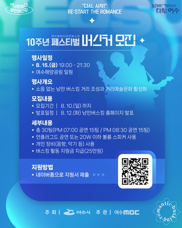 이번 행사는 ‘여수밤바다 낭만버스킹’ 10주년을 기념하고 광복절 연휴를 맞아 시민과 관광객에게 여름밤의 특별한 문화 향유 기회를 제공하고자 기획됐다.