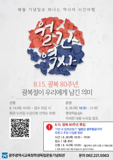 강연은 ‘광복 80주년, 광복절이 우리에게 남긴 의미’라는 주제로 1945년을 전후한 역사적 사건과 의미들을 살펴보고 광복절의 의미에 대해 생각해본다.