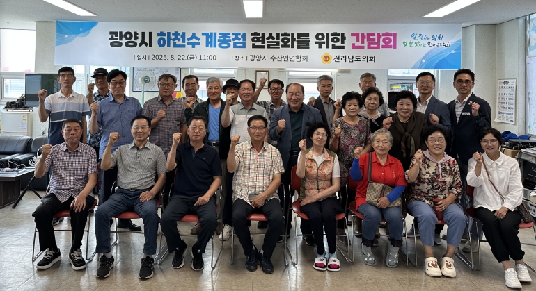 이번 간담회에는 강정일 전남도의원을 비롯해 서영배·박철수 광양시의원, 전남도의회 안전건설소방전문위원실 이창근 수석전문위원, 전라남도 장경석 자연재난과장·최순철 하천관리팀장·이재원 수자원관리과장·이준호 수자원팀장, 광양시 김민영 안전도시국장, 그리고 광양시 수산인연합회 최규석 회장을 비롯한 회원 40여 명과 관계 공무원들도 함께 자리해 열띤 논의를 벌였다.
