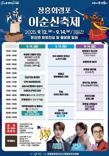 김성 장흥군수는 “회령포 이순신 축제는 명량대첩의 기포지인 회령포의 역사적 의미를 되새기고, 군민과 관광객이 하나되는 문화·예술·역사가 함께 있는 뜻깊은 축제”라며 “올해는 더욱 풍성한 볼거리와 즐길거리를 준비했으니 많은 관심과 참여를 바란다”고 전했다.
