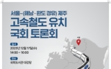 전남 코리아피플뉴스2025. 12.07[코리아피플뉴스]해남군은 오늘 17일 국회도서관 대강당에서 해남과 완도를 경유해 제주까지 연결되는‘서울~(해남·완도 경유) 제주 고속철도 유치 국회토론회’를 개최한다. 이번 토론회는 지역구 의원인 박지원 의원을 비롯한 해남 출신인 민홍철·민병덕·민형배 의원과 완도 출신의 허종식·손명수 의원이 공동 주최하며, 해남군과 완도군이 주관한다. 토론회는 서울~제주간 고속철도의 당위성을 설명하고 국회 차원에서 대국민 홍보를 통한 분위기 확산으로 제5차철도망 구축계획 반영을 위해 마련됐다. 서울~제주 고속철도 건설사업은 총사업비 27조…