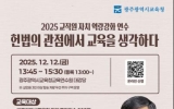 [코리아피플뉴스]광주시교육청은 오는 12일 오후 1시45분부터 광주시교육청교육연수원 대강당에서 문형배 전 헌법재판관을 초빙해 ‘교직원 자치 역량 강화 연수’를 개최한다. 이번 연수는 시교육청의 ‘헌법과 민주주의 수호 기간’을 맞아 헌법적 가치에 기반한 민주적 학교 자치 실현을 위해 마련됐다. 문 전 재판관은 ‘헌법의 관점에서 교육을 생각하다’라는 주제로 민주적 교육 현장에서 요구되는 자율성·책임성·민주성의 의미를 소개할 예정이다. 시교육청은 이날 연수에 앞서 헌법 수호의 의미를 다지기 위한 ‘헌법 조항 쓰기 릴레이’ 행사도…