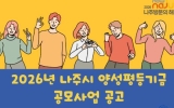 진도 코리아피플뉴스2026. 03.19[코리아피플뉴스]전남 나주시가 일·생활 균형과 양성평등 문화 확산, 돌봄과 안전 복지 지원을 위한 ‘2026년 나주시 양성평등기금 공모사업’을 추진한다. 19일 나주시에 따르면 이번 공모사업은 일자리 창출과 일·생활 균형, 양성평등 문화 확산, 돌봄·안전·복지 지원, 지역특화사업 등 총 4개 분야를 대상으로 진행된다. 올해 지원 규모는 4천만 원으로 사업 내용과 예산 편성에 따라 사업별 최대 1천만 원까지 지원하며 단체별 1개 사업에 한해 신청할 수 있다. 신청 자격은 공고일 기준 나주시에 주소를 두고 있는 비영리법인 또는 비…