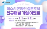 여수 코리아피플뉴스2026. 03.18[코리아피플뉴스]여수시가 오는 3월 31일까지 ‘온라인 설문조사 신규 패널 가입 이벤트’를 실시한다고 밝혔다. 시에 따르면 시정 정책 전반에 시민의 의견 수렴하기 위해 온라인 설문조사를 추진 중이며 ‘온라인 설문조사 패널’에 가입하면 각종 설문조사에 참여할 수 있다. 이벤트 기간은 오는 3월 31일까지이며 여수시민이면 누구나 가입 가능하다. 패널 가입은 이벤트 기간 이후에도 연중 가입할 수 있다. 가입 방법은 아래 QR코드를 통해 접속하거나 여수시 온라인 설문조사 누리집에 접속한 뒤 우측 상단 ‘패널 가입하기’를 클릭해 휴대폰…