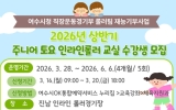 여수 코리아피플뉴스2026. 03.12[코리아피플뉴스]여수시가 지역 유소년을 대상으로 ‘2026년 상반기 주니어 토요 인라인롤러 교실’을 운영하고 오는 3월 16일부터 20일까지 수강생을 선착순 모집한다. 이번 프로그램은 관내 유치원생과 초등학생 50명을 대상으로 진행되며 여수시청 직장운동경기부 롤러팀 선수들이 재능기부 형식으로 직접 지도에 나선다. 참가자들은 기본적인 롤러교육과 기초기술을 배우고 인라인롤러 주행 능력을 향상할 수 있는 다양한 기술을 익히게 된다. 신청은 수강을 희망하는 유치원·초등학생 보호자가 여수시OK통합예약시스템을 통해 신청할 수 있다. …