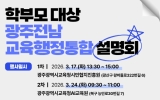 교육 코리아피플뉴스2026. 03.11[코리아피플뉴스]광주시교육청이 학부모의 교육행정통합 궁금증을 해소하기 위해 두 차례에 걸쳐 ‘광주·전남 교육행정통합 설명회’를 개최한다. 첫 번째 설명회는 17일 오후 1시30분 광주시민협치진흥원에서 열리며, 이어 24일 오전 9시30분 AI교육원에서도 진행된다. 설명회는 ▲교육행정통합 추진 배경 및 경과 안내 ▲통합 이후 교육정책 변화와 전망 설명 ▲학부모 질의에 대한 답변 등 순으로 운영된다. 특히 이정선 교육감이 교육행정통합 추진 경과, 전망 등을 설명하고 학부모들의 질의에 응답하며 궁금증을 해소할 예정이다. 참여를 희…