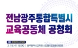 장성 코리아피플뉴스2026. 03.10[코리아피플뉴스]광주시교육청 ‘광주전남교육행정통합실무단’과 전남도교육청 ‘전남광주교육행정통합추진단’이 교육통합과 관련해 시도민의 이해를 돕기 위해 ‘전남광주통합특별시 교육공동체 공청회’를 개최한다. 이번 공청회는 광주 실무준비단과 전남 통합추진단이 지난 9일 실무 협의회를 통해 광주전남 통합교육체계 구축을 위한 교육공동체 의견수렴의 필요성에 대해 공감대를 형성하면서 마련했다. 공청회는 18일 오후 3시 광주시민협치진흥원 대강당과 23일 오후 3시 전남 순천만생태문화교육원 등에서 두 차례에 걸쳐 진행된다. 주요 내용은 ▲교육행정…