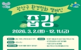 구청 코리아피플뉴스2026. 03.08[코리아피플뉴스]광주 광산구가 기후 위기 대응과 청결한 도심 환경 조성을 위해 환경정화 캠페인 ‘줍김’을 추진한다. 줍깅은 쓰레기를 주우며 조깅(또는 걷기)을 하는 활동으로, 환경 보호와 개인의 건강 증진을 동시에 실천할 수 있는 일상 환경 운동 캠페인이다. 이번 활동은 12월까지 광산구 전역에서 참여할 수 있으며, 희망자는 광산구 걷기 앱인 ‘워크온’ 설치 후 ‘광산구 줍깅 커뮤니티’에 가입해서 줍깅 활동사진을 올리면 된다. 특히 월 5회 이상 인증한 참여자, 캠페인을 소개한 참여자 등에게 매월 다양한 행사와 추첨을 통해 모…