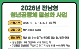 전남 코리아피플뉴스2026. 04.13[코리아피플뉴스] 광양시는 4월 13일부터 4월 27일까지 ‘2026년 전남형 청년공동체 활성화 사업’에 참여할 청년공동체를 모집한다. 청년공동체 활성화 사업은 청년들이 공동체 활동에 참여하며 지역사회 활동 주체로 성장할 수 있도록 지원하는 사업이다. 심사를 통해 선정된 8개 팀에 팀별 최대 600만 원의 활동비가 지원된다. 신청 대상은 18세부터 45세까지의 청년 5인 이상으로 구성된 공동체로, 구성원의 60% 이상이 광양시에 거주해야 한다. 선정된 공동체는 6월부터 11월까지 지역 기반 활동을 추진한다. 지원 분야는…