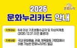 전남 코리아피플뉴스2026. 02.02[코리아피플뉴스 / 김영현 기자] 2월 2일부터 광주문화재단(대표이사 직무대행 전은옥)은 6세 이상 기초생활수급자 및 차상위계층을 대상으로 2026년 문화누리카드 발급과 사용이 가능하다고 밝혔다. 2026년 문화누리카드 지원금은 지난해 대비 1만 원 인상된 1인당 15만 원이며, 청소년기(2008~2013년생)와 준고령기(1962~1966년생) 대상자에게는 1만 원이 추가 지원된다. 카드 발급 기간은 2월 2일부터 11월 30일까지로, 광주광역시 96개 동 행정복지센터에 방문하거나, 문화누리카드 누리집과 모바일 앱,…