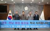 [코리아피플뉴스]담양군·함평군·영광군·장성군 등 전남 4개 군의회 의장단은 30일 영광군의회에서 광주–전남 행정통합을 염원하는 공동 퍼포먼스에 참여했다. 이번 퍼포먼스는 행정구역의 경계를 넘어 광주와 전남이 하나의 생활권이자 경제권으로 도약하기 위한 의지와 공감대를 확인하기 위해 마련됐다. 특히 지역 간 협력과 상생 발전의 필요성에 대해 지방의회 차원에서 뜻을 모았다는 점에서 의미를 더했다. 의장단은 “행정통합은 지역의 미래 경쟁력 확보와 균형발전을 위해 더 이상 미룰 수 없는 과제”라며 “지금이야말로 광주와 전남의 미래를 결정…
