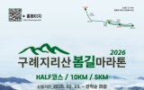 구례 코리아피플뉴스2026. 03.13[코리아피플뉴스]전남 구례군은 아름다운 자연환경을 배경으로 한 ‘제1회 구례 지리산봄길 마라톤대회’가 오는 5월 2일 구례공설운동장에서 개최된다고 밝혔다. 이번 대회는 오마이뉴스 광주전라본부와 구례군육상연맹이 주최·주관하고 구례군이 후원하는 행사로 마라톤 종목 저변 확대와 구례 지역 홍보를 위해 마련됐다. 대회종목은 하프코스(21.0975km), 10km, 5km 총 3개 부문이다. 참가자들은 오전 8시 30분부터 순차적으로 출발해 지리산의 봄 풍경을 따라 달리게 된다. 참가 신청은 2월 23일부터 공식 홈페이지를 통해 접수를…