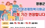 영광 코리아피플뉴스2025. 10.21[코리아피플뉴스]영광군은 전 군민에게 50만 원(2차분)을 지급하는 민생경제회복지원금 신청 기간을 10월 31일까지 2주 더 연장한다. 2차 민생경제회복지원금은 지난 9월 1일부터 10월 15일까지 49,230명에게 246억 원이 지급됐고, 1차 민생경제회복지원금 신청 대비 미신청자가 많은 것으로 나타났다. 이와 관련하여 군은 군민들 중 출타로 인한 부재, 민생회복 소비쿠폰과 신청기간(9. 22.∼10. 31.)을 혼동하여 신청하지 못하는 사례가 있음을 반영하여 지원금을 신청하지 못한 군민들이 혜택을 빠짐없이 받을 수 있도록 신…