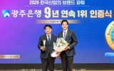 전남 코리아피플뉴스2026. 04.16[코리아피플뉴스]광주은행은 16일, 한국능률협회컨설팅(KMAC)이 주관하는‘2026 한국산업의 브랜드파워(K-BPI)’지방은행 부문 9년 연속 1위 선정에 따른 인증식을 개최했다고 밝혔다. 이날 인증식은 광주은행 본점에서 열렸으며, 정일선 광주은행장과 송광호 한국능률협회컨설팅 그룹장을 비롯한 임직원 및 관계자들이 참석해 브랜드 경쟁력 확보 성과를 공유하고, 지속적인 성장 의지를 다지는 시간을 가졌다. ‘한국산업의 브랜드파워(K-BPI)’는 국내 주요 산업을 대상으로 소비자 조사를 실시해 브랜드 인지도와 충성도 등을 종합적으로…