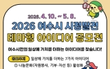 [코리아피플뉴스]여수시는 시민들의 참신하고 창의적인 의견을 정책에 반영해 ‘시민이 참여하는 시정’을 실현하고자 오는 4월 10일부터 5월 8일까지 ‘2026년 여수시 시정발전 테마형 아이디어 공모전’을 실시한다고 밝혔다. 이번 공모전은 ‘일상에 가치를 더하는 7가지 아이디어’라는 주제로, 시민 생활과 밀접한 현안들에 대한 해결 방안을 발굴하기 위해 마련됐다. 공모 분야는 시민 삶의 질을 높일 수 있는 7개 분야로 ▲나눔문화(자원봉사, 기부 등) 활성화 ▲1회용품 사용감량 ▲불법 옥외광고물 정비 및 활용 ▲자전거 이용 활성화 ▲지…
