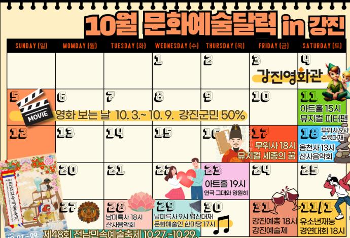 이번 프로그램들은 강진군청 문예진흥팀 주관으로, 공연·전시·체험·영화 등 다양한 장르를 망라하며, 세대별·계층별 맞춤형으로 구성됐다.