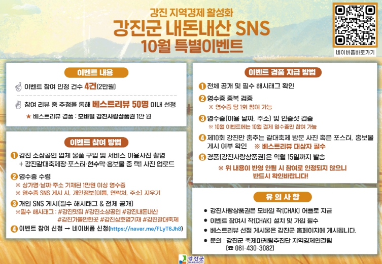 이벤트 참여 경품은 참여일 기준 익월 15일까지 모바일 강진사랑상품권으로 지급되며, 리뷰 1건당 5,000원씩 최대 4건까지 인정된다. 이벤트 참여 시 지역상품권 착(chak) 어플 설치 및 가입이 필요하며, 이용했던 가게의 상호명 기재, 필수 해시태그나 영수증 개인정보(이름, 전화번호, 주소 등 가리고 게시 권장) 등을 유의해야 한다.