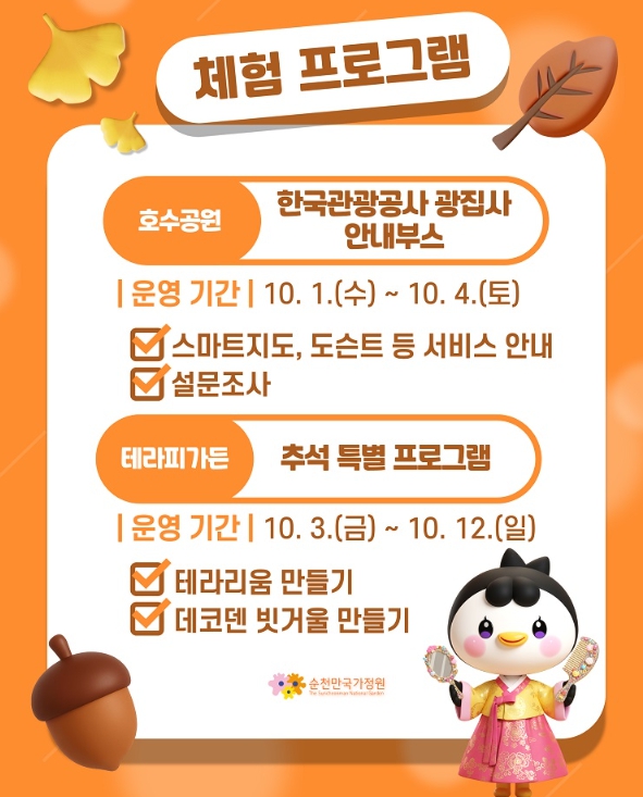 이번 한가위 특별 프로그램은 자연과 함께하는 생태‧예술 교육으로 정원의 가치를 알리고, 전통 공연과 놀이, 한복데이 같은 문화 프로그램은 국가정원의 문화적 공간성이 더욱 확장되는 계기가 될 예정이다.