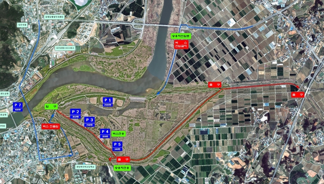 축제장에서 나가는 길은 제 1주차장의 경우 입구 반대편 출구를 이용해 물넘이 구간 삼거리로 진입해 제방도로나 영산천 방향으로 빠져나가면 된다. 또 축제장이나 인근 임시주차장 이용 차량이 행사장에서 나올 때는 영산천이나 전남외국어고교 방향으로 빠져나가도록 했다.