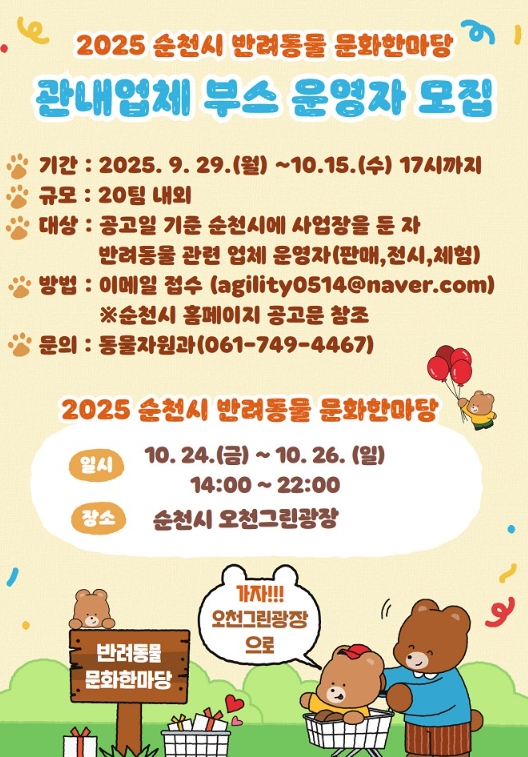 모집 대상은 공고일 기준 순천시에 사업장을 둔 자로 유치원, 미용, 용품 판매, 반려동물 동반 음식점과 숙소 등 반려동물 관련 업종 운영자와 반려인과 비반려인이 모두 참여할 수 있는 체험부스를 운영할 사업자로, 오는 15일 17시까지 전자우편으로 신청하면 된다.
