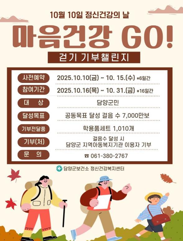 ‘마음건강 고(GO)! 걷기 기부챌린지’는 군민이 일상에서 걷기를 실천하며 정신건강 증진과 나눔을 동시에 실현하는 행사다. 10월 16일부터 31일까지 16일간 7천만 보의 공동걸음을 목표로 진행한다.