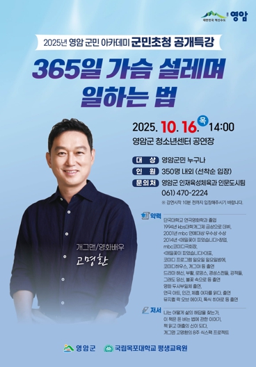 노재영 영암군 인재육성체육과장은 “영암군민이 일상에서 행복과 설렘을 발견하길 바라는 마음으로 이번 특강을 준비했다. 많은 분들이 고명환 작가와 함께 해 삶의 의미를 더 깊게 가꿔보길 바란다”고 전했다.