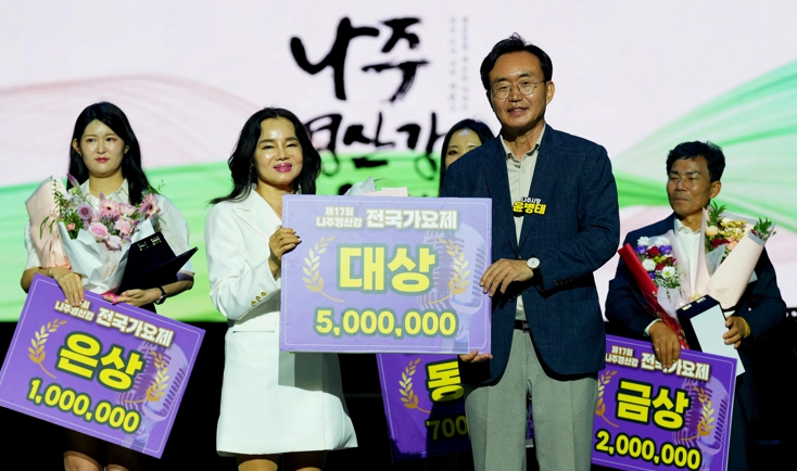 | | 윤병태 시장(오른쪽)이 ‘제17회 나주 영산강 전국 가요제’에서 대상을 수상한 장성희 씨에게 상금 500만 원을 전달하고 기념사진을 찍고 있다. |
