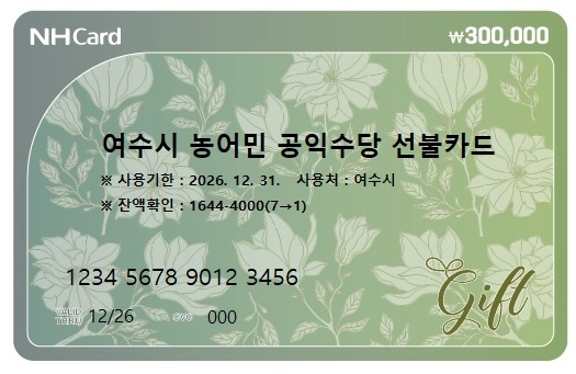 여수시 관계자는 “선불카드는 사용 편의성과 보안성이 높고 잔액 확인과 재발급도 가능해 농어민의 만족도가 크게 향상될 것으로 기대된다”며 “공익수당이 지역경제 선순환 구조에도 기여할 수 있도록 제도를 지속 개선해 나가겠다”고 말했다.