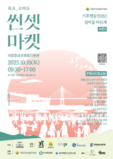 정희록 국립호남권생물자원관 상생협력부장은 “2024년에 이어 올해 두 번째로 열리는 고하도 썬셋 마켓이 섬마을의 복합 문화 행사로 자리매김하기를 기대한다.”라며 “가족이 함께 고하도를 찾아가 가을을 여유롭게 즐기는 소풍이 되길 바란다”라고 말했다.