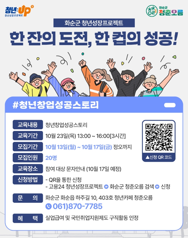 프로그램은 각각 2025년 10월 23일 목요일, 24일 금요일 오후 13시부터 3시간 동안 진행되며, 장소는 참여자에게 개별 문자로 안내될 예정이다. 청년 누구나 신청이 가능하며, 선착순 20명 마감이다. 신청 방법은 포스터 QR코드 또는 고용24 → 청년성장프로젝트 → 화순군 청춘오름을 검색하여 신청할 수 있다.
