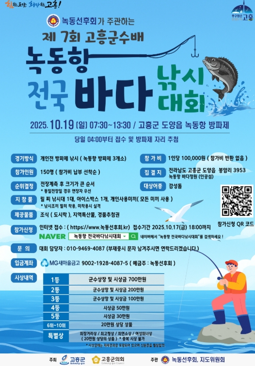 참가 신청은 오는 17일까지 온라인(네이버 ‘녹동항 전국바다낚시대회’ 검색)을 통해 선착순 150명을 대상으로 사전접수를 받는다.