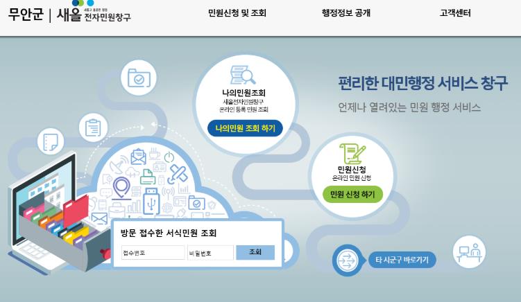 이번에 개설된 '무안군 전자민원창구'는 접근이 편리하도록 무안군청 홈페이지 메인화면의 무안군 전자민원창구와 연계되어 간단한 본인인증 절차만 거치면 이용할 수 있다.