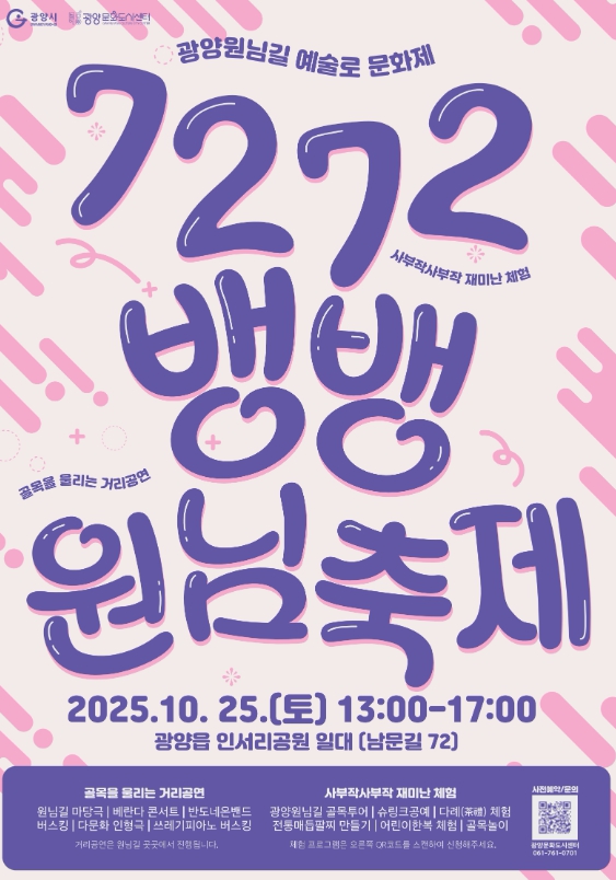가족 단위 관람객을 위한 체험 프로그램도 풍성하다. 역사문화를 짚으며 원님길을 함께 돌아보는 ▲‘원님길 골목투어’, 광양의 이야기를 담은 ▲‘아트굿즈 만들기 체험’과 ▲‘슈링크 공예’, 전통 차와 예절을 함께 배우는 ▲‘다례(茶禮) 체험’, 애니메이션 〈케데헌(K-POP Demon Hunters)〉에 등장해 세계적으로 주목받은 ▲‘전통매듭팔찌 만들기’, ▲‘어린이 한복 체험’ 등 다양한 체험 프로그램과 골목놀이, 이벤트가 준비돼 있다.