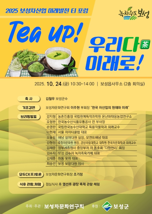 10월 24일 열리는 보성읍사무소에서 열리는 ‘보성차산업 미래 발전 티 포럼’은 국내 차전문가와 학계 인사가 모여 현재 차산업 트렌드를 공유하고 미래 발전 방향을 논의하는 자리로 마련된다.