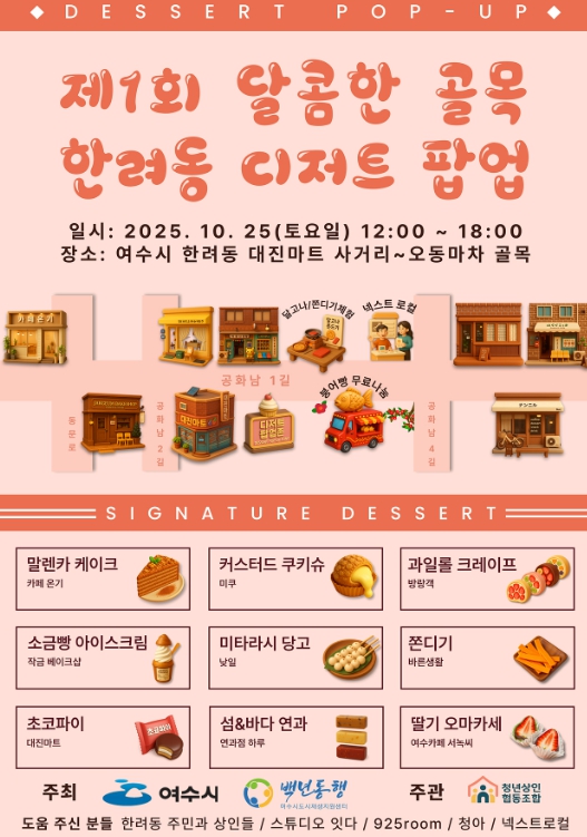 그 일환으로 시는 ‘달콤한 골목 한려동, 디저트 팝업’ 행사를 오는 25일(토) 오후 12시부터 6시까지 한려동 대진마트 사거리~오동마차 구간 일대에서 개최한다.