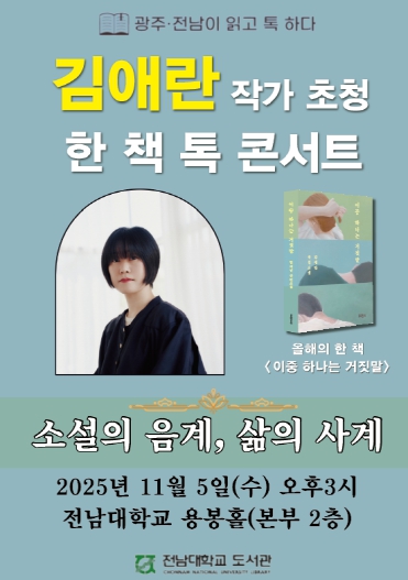 29일 전남대(총장 이근배)에 따르면 오는 11월 5일 오후 3시 전남대학교 용봉홀에서 「이중 하나는 거짓말」의 저자 김애란 작가를 초청해 ‘작가 초청 한 책 톡 콘서트’를 개최한다.