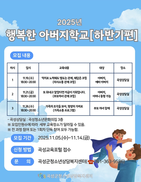 교육은 오는 19일부터 26일까지 총 3회에 걸쳐 곡성군청소년상담복지센터에서 진행된다.