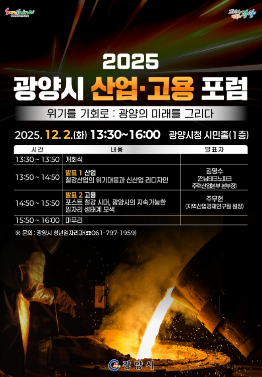 조동수 광양시 청년일자리과장은 “이번 산업·고용 포럼은 광양이 직면한 중대한 변화 속에서 위기를 기회로 전환하기 위한 실질적인 논의를 진행하는 자리”라며 “관심 있는 시민과 기업·기관 관계자 여러분의 많은 참여를 바란다”고 말했다.